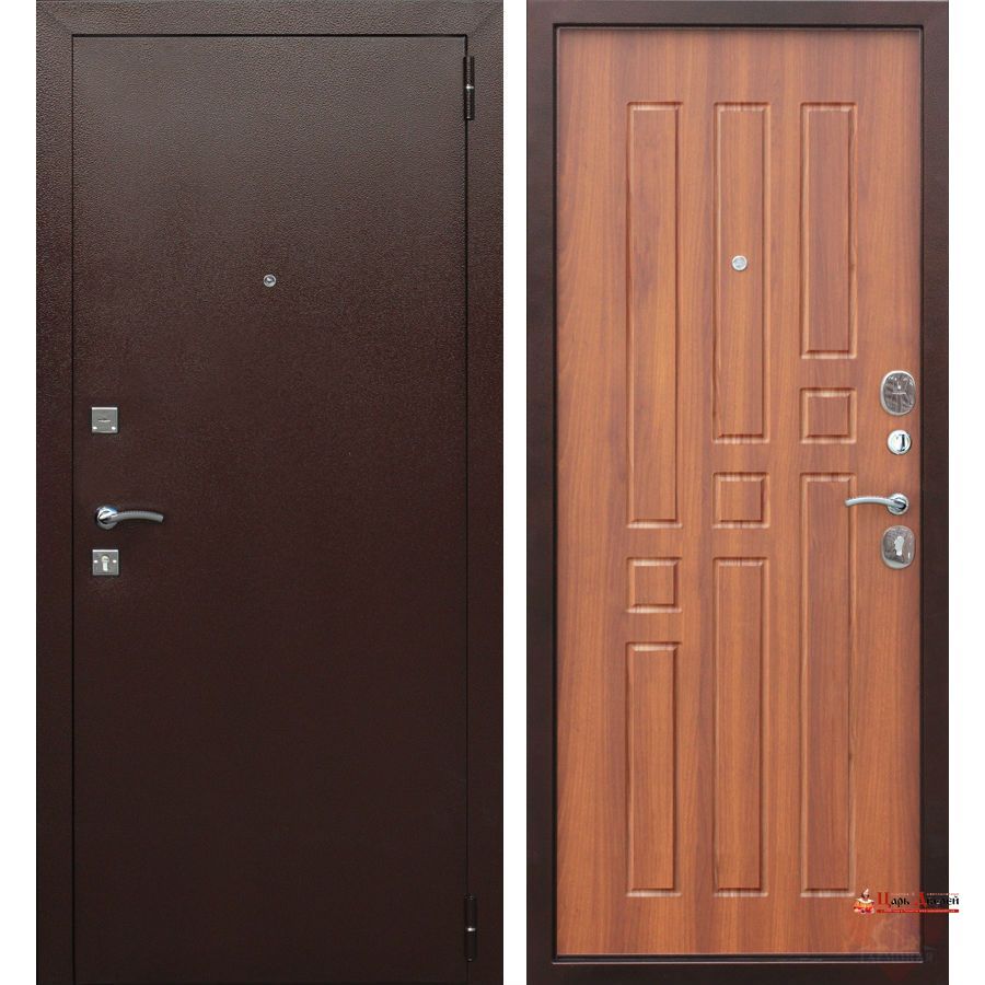 Внешнее покрытие: порошково-полимерное, медный "Антик" Внутренне покрытие:МДФ-панель, толщиной 8 мм, цвет: Венге, Белый Ясень, Рустикальный дуб Толщина металла на полотне и раме: 1,2 мм Толщина дверного полотна: 60 мм Наполнитель: Пенополистирол Уплотнитель: D-образный на коробе и полотне, 2 контура Петли: евро на подшипниках, открывание 180° Замок : цилиндровый RIGGER Замок: сувальдный RIGGER Ночная задвижка: да Открывание: левое/правое Услуги по установке, а также откосы не входят в стоимость