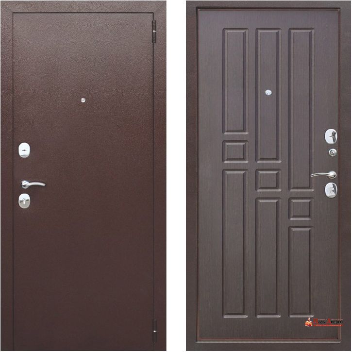 Внешнее покрытие: порошково-полимерное, медный "Антик" Внутренне покрытие:МДФ-панель, толщиной 8 мм, цвет: Венге, Белый Ясень, Рустикальный дуб Толщина металла на полотне и раме: 1,2 мм Толщина дверного полотна: 60 мм Наполнитель: Пенополистирол Уплотнитель: D-образный на коробе и полотне, 2 контура Петли: евро на подшипниках, открывание 180° Замок : цилиндровый RIGGER Замок: сувальдный RIGGER Ночная задвижка: да Открывание: левое/правое Услуги по установке, а также откосы не входят в стоимость